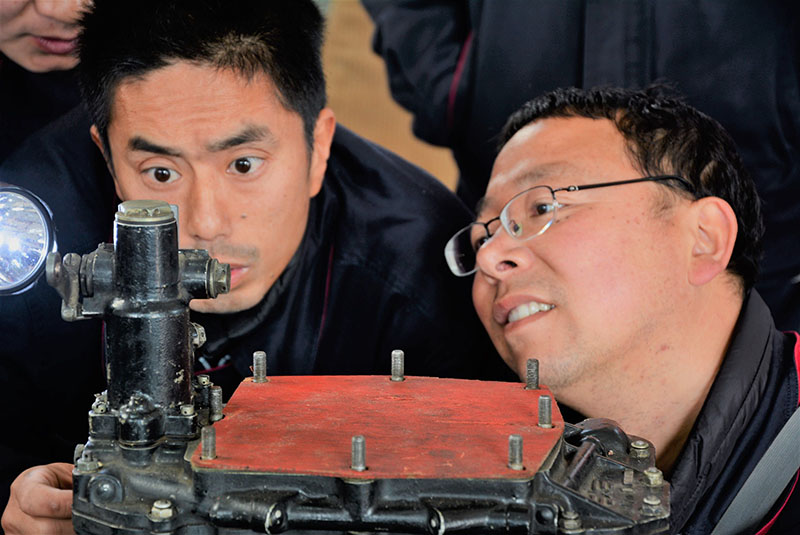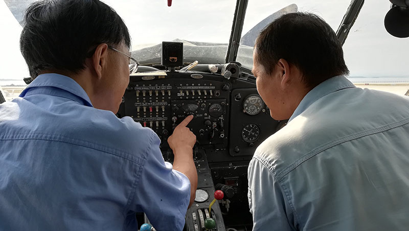 楊必武(圖右一)于2011年從學(xué)校畢業(yè)到荊門通航機(jī)務(wù)工程部從事機(jī)務(wù)維修工作,公司指派了理論基礎(chǔ)扎實(shí)、維修經(jīng)驗(yàn)豐富的機(jī)械師羅暉(圖左一)作為他的師傅。7年時間的培養(yǎng),楊必武目前已考取了維修執(zhí)照,成為機(jī)械維修隊伍中青年主力擔(dān)當(dāng)。