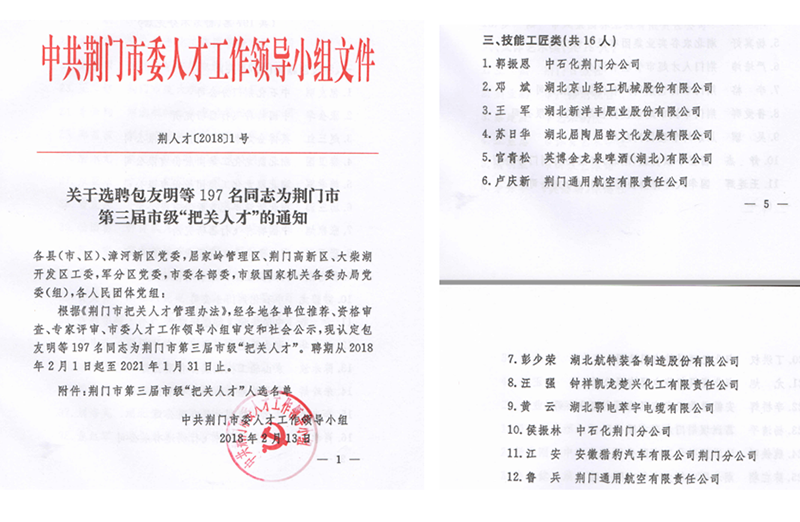 荊門通航兩名員工成功入選 荊門市“把關人才”